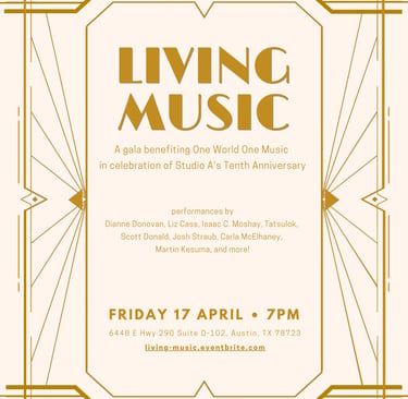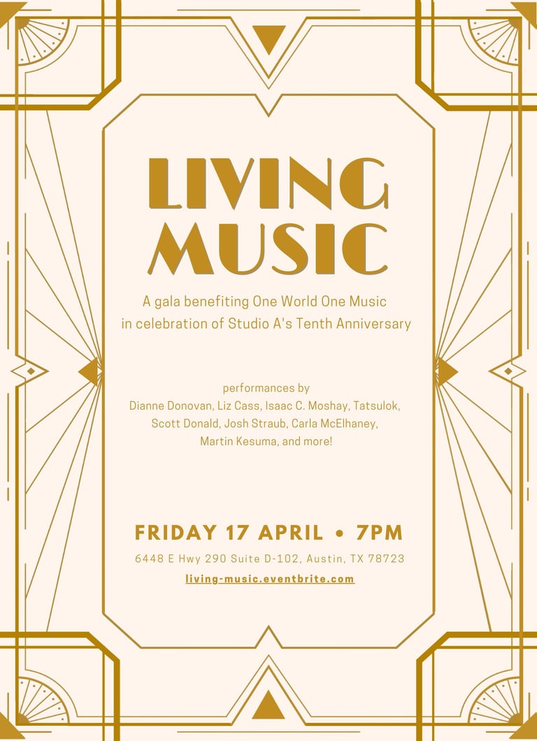 Join Studio A in a one-of-a-kind celebration honoring 10 years of creating amazing musical experiences for the Austin community. This family-friendly gala explores what it means to "live music" with leading musicians from the Austin arts community, including Dianne Donovan, Isaac C. Moshay, Liz Cass, Tatsulok, and more. All proceeds benefit Studio A's One World One Music series.